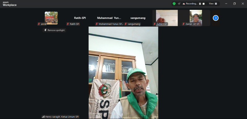 Henry Saragih selaku Ketua Umum SPI memberikan sambutan sekaligus membuka webinar ini dengan kilas balik lahirnya UNDROP. Ia mengingatkan bahwa UNDROP lahir dari perjuangan panjang petani yang dimulai dari kampung-kampung hingga ke tingkat internasional. “Bertepatan dengan 17 Desember waktu New York, deklarasi hak asasi petani yang kita perjuangkan dari kampung-kampung akhirnya diakui di tingkat internasional. Kita, para petani bersama SPI dan seluruh anggota La Via Campesina, telah berjuang hingga ke berbagai negara seperti Brasil, Spanyol, bahkan Zimbabwe. Jika dibandingkan dengan perjuangan masyarakat adat atau buruh, perjuangan petani di tingkat internasional tergolong singkat. Dalam kurun waktu 17 tahun, kita sudah berhasil memiliki UNDROP,” ujarnya.